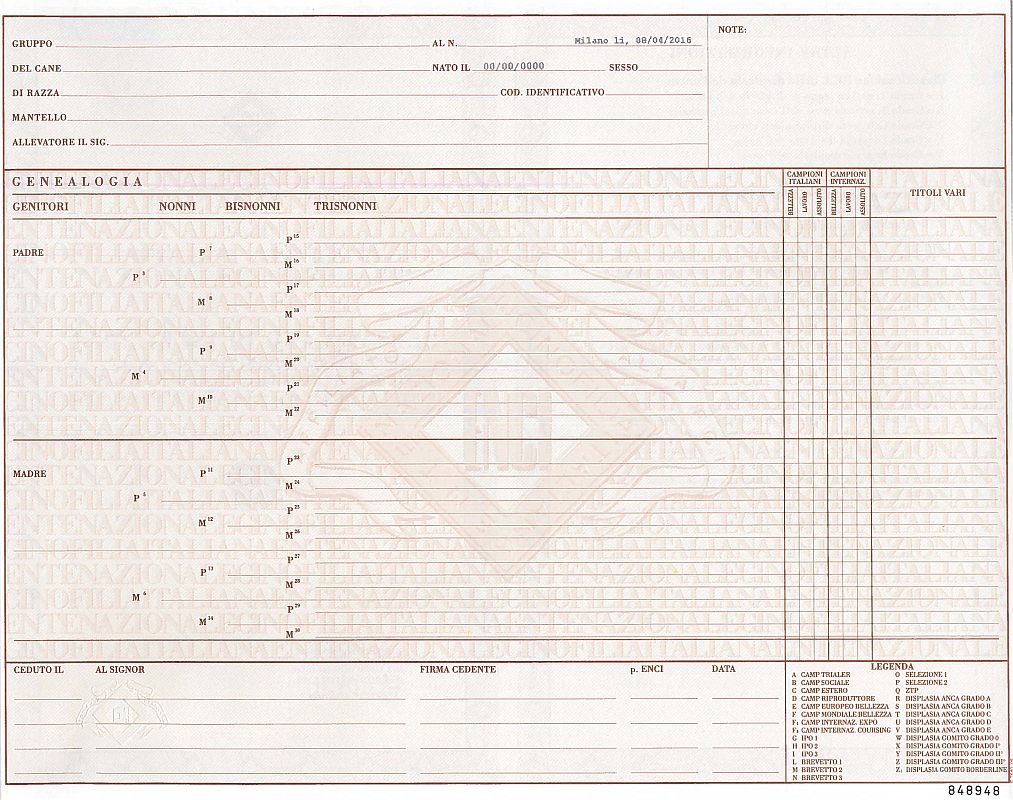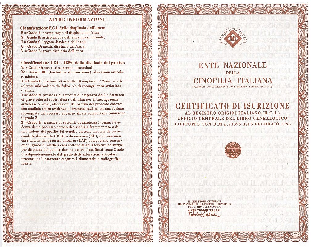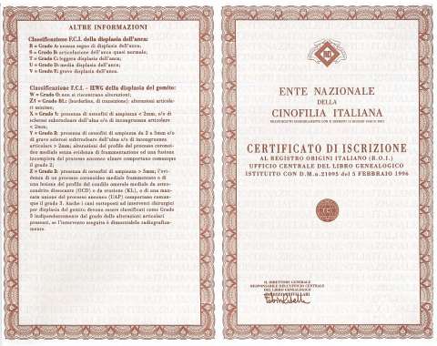 - L'albero genealogico completo fino ai trisnonni, con tanto dei loro risultati dell'esame radiologico per la displasia (se effettuato) e dei titoli di "campione" conseguiti.